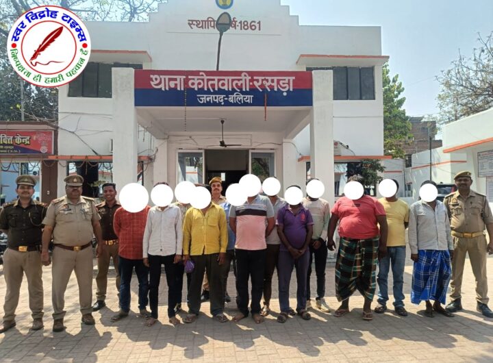 थाना रसड़ा जनपद बलिया पुलिस द्वारा जुआ खेलने वाले 12 नफर अभियुक्तों को गिरफ्तार कर अभियुक्तों के कब्जे से जुआ खेलते समय जुआ सामाग्री 52 ताश के पत्ते, 83010-/ रूपये, 10 अदद मोबाइल फोन तथा 05 अदद मोटर साइकिल किया गया बरामद !