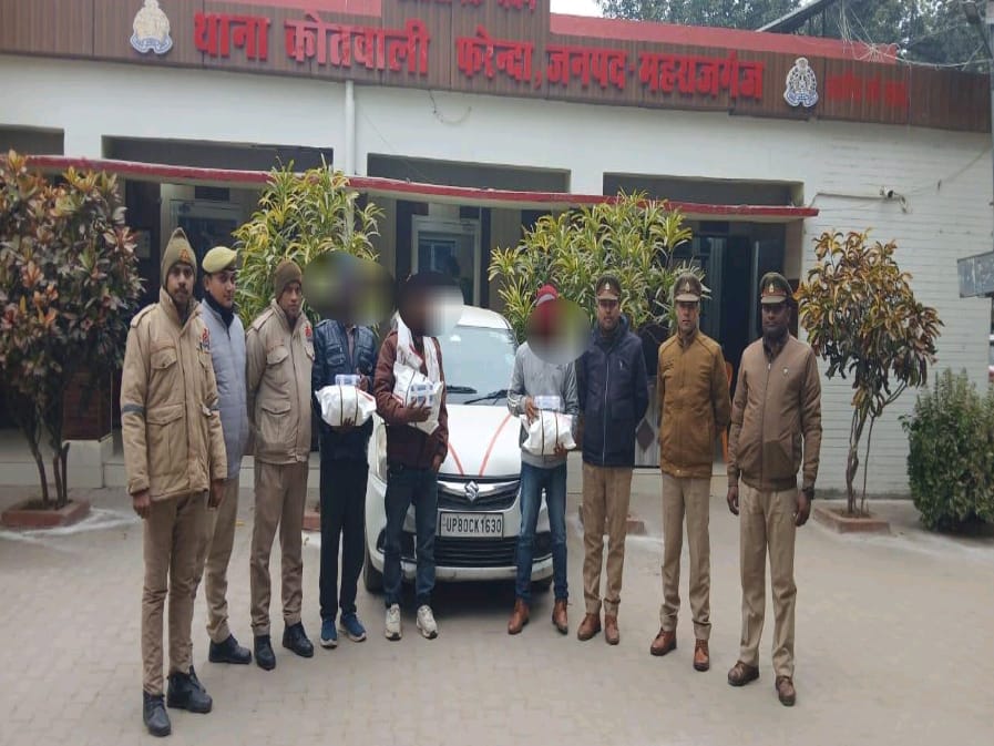 29 दिसंबर 2025 : पुलिस अधीक्षक महराजगंज श्री सोमेन्द्र मीना के निर्देशन एवं मार्गदर्शन में अपराध एवं अपराधियों के विरुद्ध चलाए जा रहे विशेष अभियान के तहत संदिग्ध व्यक्तियों/वाहनों* की सघन चेकिंग की जा रही है। इसी क्रम में *थाना फरेंदा* महराजगंज की टीम को मुखबिर सूचना मिली कि *एक सफेद रंग की स्विफ्ट डिजायर कार में कुछ लोग अवैध गांजा लेकर जा रहे हैं।सूचना पर त्वरित कार्रवाई करते हुए पुलिस टीम ने बनकटी मोड़ (वफासला से 04 किमी पश्चिम-उत्तर) पर घेराबंदी कर कार को रोका। तलाशी के दौरान कार सवार तीनों अभियुक्तों के पास से कुल 3.870 किलोग्राम अवैध गांजा बरामद किया गया। साथ ही तीन मोबाइल फोन एवं तस्करी में प्रयुक्त स्विफ्ट डिजायर कार (रजिस्ट्रेशन नंबर UP80CK1630) भी जप्त की गई।