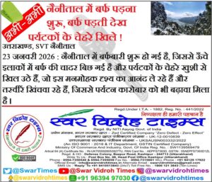 23 जनवरी 2026 : नैनीताल में बर्फबारी शुरू हो गई है, जिससे ऊँचे इलाकों में बर्फ की चादर बिछ गई है और पर्यटकों के चेहरे खुशी से खिल उठे हैं, जो इस मनमोहक दृश्य का आनंद ले रहे हैं और तस्वीरें खिंचवा रहे हैं, जिससे पर्यटन कारोबार को भी बढ़ावा मिला है ।