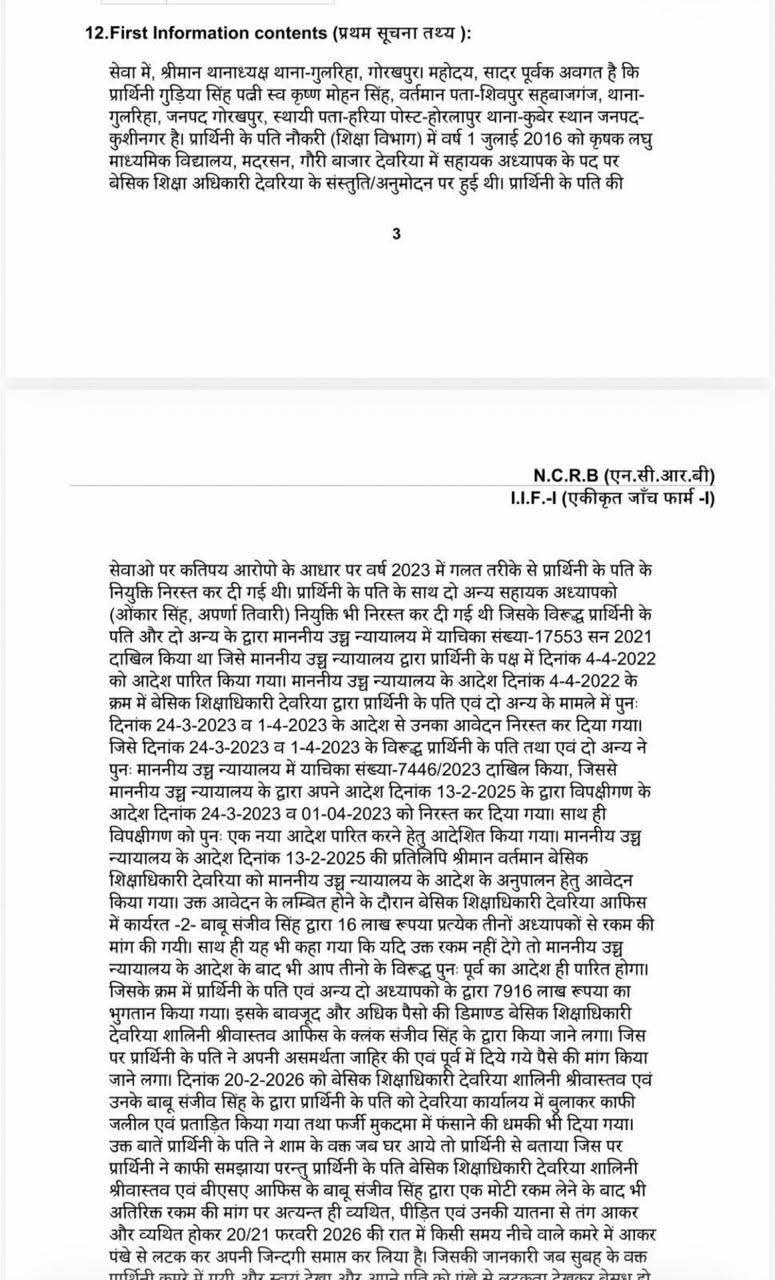 23 फरवरी 2026: जिले के शिक्षक स्वर्गीय कृष्ण मोहन सिंह की आत्महत्या के मामले ने बेसिक शिक्षा विभाग में हड़कंप मचा दिया है। मृतक शिक्षक द्वारा छोड़े गए सुसाइड नोट और वायरल वीडियो में विभागीय अधिकारियों एवं कर्मचारियों पर गंभीर आरोप लगाए गए हैं, जिसके बाद प्रशासनिक और पुलिस स्तर पर कार्रवाई तेज कर दी गई है| इस प्रकरण को अत्यंत गंभीरता से लेते हुए संबंधित बेसिक शिक्षा अधिकारी (बीएसए) तथा अन्य कर्मचारियों के विरुद्ध गुलरिहा थाना में गंभीर धाराओं में मुकदमा दर्ज किया गया है। पुलिस मामले की विस्तृत जांच में जुटी हुई है| घटना की सूचना शासन को भेजे जाने के बाद उत्तर प्रदेश के बेसिक शिक्षा मंत्री संदीप सिंह को अवगत कराया गया। शासन स्तर पर निष्पक्ष जांच सुनिश्चित करने के लिए मुख्य विकास अधिकारी (सीडीओ) की अध्यक्षता में एक जांच समिति का गठन किया गया है। प्रशासनिक अधिकारियों ने इस घटना को अत्यंत दुर्भाग्यपूर्ण और पीड़ादायक बताते हुए कहा है कि शोकाकुल शिक्षक परिवार के प्रति गहरी संवेदनाएँ व्यक्त की जाती हैं| साथ ही यह भी आश्वासन दिया गया है कि जांच में दोषी पाए जाने वाले अधिकारियों एवं कर्मचारियों के विरुद्ध कठोरतम कार्रवाई की जाएगी तथा पीड़ित परिवार को न्याय दिलाने के लिए हर स्तर पर प्रयास किए जाएंगे| बताया जा रहा है कि यह मामला गुलरिहा थाना क्षेत्र से संबंधित है, जहां पुलिस एवं प्रशासन संयुक्त रूप से साक्ष्य संकलन और बयान दर्ज करने की कार्रवाई कर रहे हैं| क्षेत्राधिकारी गोरखनाथ द्वारा भी घटना के संबंध में विस्तृत जानकारी दी गई है|