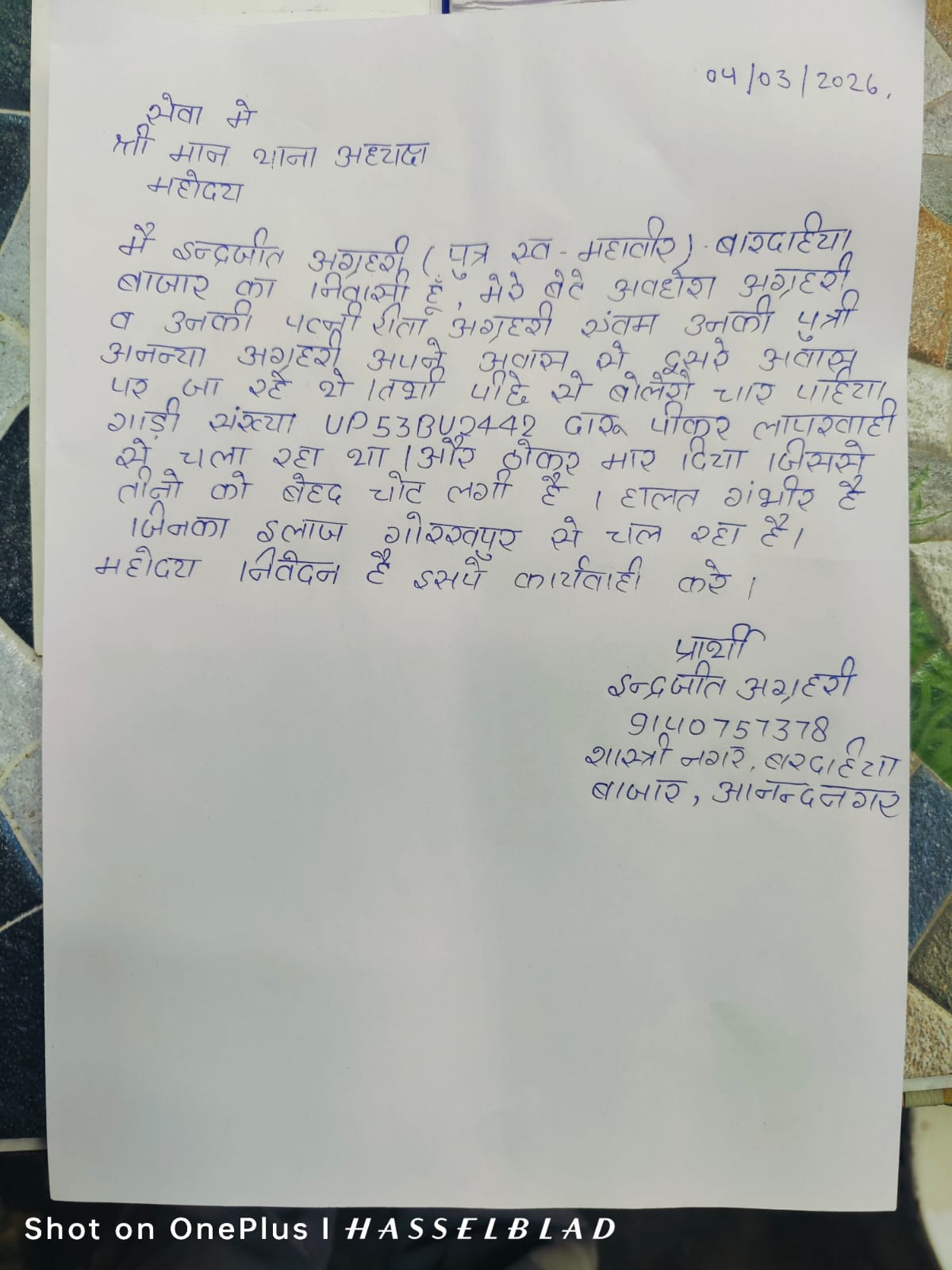 5 मार्च 2026 : महराजगंज जनपद के फरेंदा क्षेत्र में होली के दिन एक दर्दनाक सड़क हादसे का मामला सामने आया है। प्राप्त जानकारी के अनुसार बोलेरो (वाहन संख्या UP53BU2442) को कथित रूप से शराब के नशे में लापरवाहीपूर्वक और रॉन्ग साइड चलाते हुए कई लोगों को टक्कर मार दी गई। हादसे में तीन लोग गंभीर रूप से घायल हो गए, जिनकी हालत चिंताजनक बताई जा रही है और उनका इलाज गोरखपुर में चल रहा है। घायलों में अवधेश अग्रहरि, उनकी पत्नी रीता अग्रहरि तथा पुत्री अनन्या अग्रहरि शामिल हैं। बताया जा रहा है कि तीनों अपने एक आवास से दूसरे आवास की ओर जा रहे थे, तभी पीछे से आई बोलेरो ने जोरदार टक्कर मार दी, जिससे उन्हें गंभीर चोटें आईं। इंद्रजीत अग्रहरि (निवासी – बरदहिया बाजार), पुत्र स्वर्गीय महावीर, ने फरेंदा थाने में तहरीर देकर वाहन मालिक और चालक के खिलाफ कड़ी कानूनी कार्रवाई की मांग की है। पीड़ित परिवार ने शासन-प्रशासन से न्याय की गुहार लगाई है। पुलिस द्वारा मामले की जांच की जा रही है। आगे की कार्रवाई जांच रिपोर्ट के आधार पर की जाएगी।
