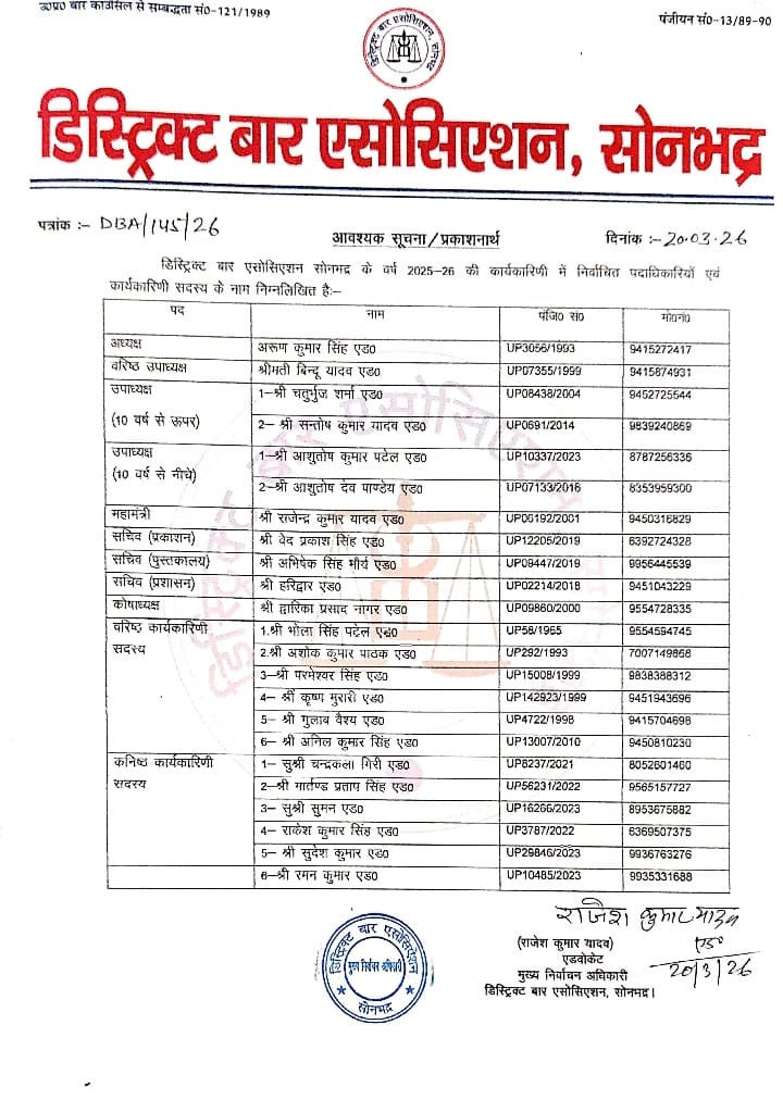20 मार्च 2026 : डिस्ट्रिक्ट बार एसोसिएशन सोनभद्र के सत्र 2025 -26 के प्रतिष्ठापरक चुनाव का निर्वाचन निर्विरोध हुआ, एल्डर कमेटी के अध्यक्ष श्री नाथ सिंह और मुख्य चुनाव अधिकारी श्री राजेश कुमार यादव एडवोकेट सहायक चुनाव अधिकारी गण श्री सुरेश सिंह कुशवाहा एडवोकेट व श्री राजकुमार पटेल एडवोकेट ने विधिवत सत्र 2025 26 की नई कार्यकारिणी के निर्विरोध निर्वाचन की घोषणा की| मुख्य चुनाव अधिकारी श्री राजेश कुमार एडवोकेट ने बताया कि नई कार्यकारिणी में अध्यक्ष पद पर श्री अरुण कुमार सिंह एडवोकेट, महामंत्री पद पर श्री राजेंद्र कुमार यादव एडवोकेट, कोषाध्यक्ष पद पर श्री द्वारिका प्रसाद नागर एडवोकेट,वरिष्ठ उपाध्यक्ष पद पर श्रीमती बिंदु यादव एडवोकेट, उपाध्यक्ष 10 वर्ष से ऊपर के लिए श्री चतुर्भुज शर्मा एडवोकेट व श्री संतोष कुमार यादव एडवोकेट तथा उपाध्यक्ष 10 वर्ष के नीचे के लिए श्री आशुतोष कुमार पटेल एडवोकेट व श्री आशुतोष कुमार पांडेय एडवोकेट, सचिव प्रशासन पद पर श्री वेद प्रकाश सिंह एडवोकेट सचिव पुस्तकालय पद पर श्री अभिषेक सिंह मौर्य व सचिव प्रशासन पद पर श्री हरिद्वार एडवोकेट तथा वरिष्ठ कार्यकारिणी पद पर श्री भोला सिंह पटेल एडवोकेट, श्री अशोक कुमार पाठक एडवोकेट, श्री परमेश्वर सिंह एडवोकेट, श्री कृष्ण मुरारी एडवोकेट, श्री गुलाब वैश्य एडवोकेट, तथा अनिल कुमार सिंह एडवोकेट निर्वाचन हुआ| इसी तरह कनिष्ठ कार्यकारिणी सदस्य पद पर सुश्री चंद्रकला गिरी एडवोकेट, श्री मार्तंड प्रताप सिंह एडवोकेट, सुश्री सुमन एडवोकेट, श्री श्री राकेश कुमार सिंह एडवोकेट, श्री सुदेश कुमार एडवोकेट एवं श्री रमन कुमार एडवोकेट का निर्विरोध निर्वाचन हुआ, उसके बाद सादे समारोह में सभी पदाधिकारियों और कार्यकारिणी सदस्यों को एल्डर कमेटी चेयरमैन श्रीनाथ सिंह एडवोकेट ने अन्य पदाधिकारियों को पद एवं गोपनीयता की शपथ दिलाई गयी| इस दौरान एल्डर कमेटी के सदस्यगण श्री निर्मलेंदु कुमार श्रीवास्तव एडवोकेट, मुस्ताक अली एडवोकेट श्री रमेश चंद्र सिंह एडवोकेट व श्री छोटेलाल गौतम एडवोकेट तथा मौजूदा अध्यक्ष श्री जगजीवन सिंह एड, रोशन लाल यादव एड, रणजीत सिंह एड वरिष्ठ उपाध्यक्ष पवन कुमार सिंह एडवोकेट, हीरालाल पटेल, महामंत्री श्री प्रदीप कुमार मौर्य एड, वी पी सिंह एड, फूल सिंह एड कामता प्रसाद यादव एड आदि लोग घोषणा के समय उपस्थित रहे ।
