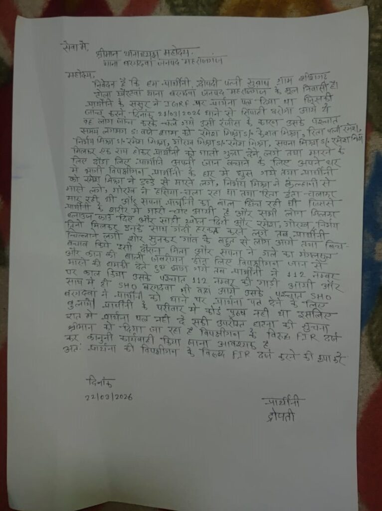 23 मार्च 2026 : जनपद के बरगदवा थाना क्षेत्र से एक बेहद गंभीर और चिंताजनक मामला सामने आया है। यहां एक महिला ने गांव के ही कुछ लोगों पर मारपीट, छेड़छाड़ और लूटपाट जैसे संगीन आरोप लगाए हैं। घटना से जुड़ा एक वीडियो भी सामने आने की चर्चा है, जिससे मामला और तूल पकड़ता जा रहा है। पीड़िता द्रोपती, पत्नी सुभाष, निवासी शीशगढ़ टोला खैरटवा, थाना बरगदवा ने थानाध्यक्ष को दिए अपने प्रार्थना पत्र में बताया कि 21 मार्च 2026 को पुलिस द्वारा की गई एक जांच के बाद रात करीब 10 बजे गांव के कुछ लोग एकजुट होकर उसके घर पर हमला करने आ पहुंचे। महिला का आरोप है कि रमेश मिश्रा, निर्भय मिश्रा, गोरख मिश्रा, केशव मिश्रा, रीता और सपना सहित अन्य लोगों ने पहले गाली-गलौज शुरू की और विरोध करने पर घर में घुसकर उसके साथ बेरहमी से मारपीट की। हमलावरों ने डंडे, कन्हौनी (लोहे का औजार) और हंसिया से हमला किया, जिससे उसे गंभीर चोटें आई हैं। पीड़िता ने यह भी आरोप लगाया कि हमलावरों ने उसके कपड़े फाड़ दिए और उसके साथ अशोभनीय हरकत की। शोर सुनकर आसपास के ग्रामीण मौके पर पहुंचे और किसी तरह बीच-बचाव कर स्थिति को शांत कराया। महिला के अनुसार, आरोपियों ने उसके गले से मंगलसूत्र और कान की बाली भी छीन ली तथा जान से मारने की धमकी देते हुए मौके से फरार हो गए। घटना के तुरंत बाद पीड़िता ने 112 नंबर पर कॉल किया, जिसके बाद पुलिस मौके पर पहुंची और मामले की जानकारी ली। हालांकि, परिवार में कोई पुरुष सदस्य न होने के कारण वह उसी रात थाने जाकर लिखित शिकायत दर्ज नहीं करा सकी। अब पीड़िता ने थाने में लिखित तहरीर देकर आरोपियों के खिलाफ एफआईआर दर्ज कर सख्त कानूनी कार्रवाई की मांग की है। पुलिस मामले की जांच में जुट गई है।