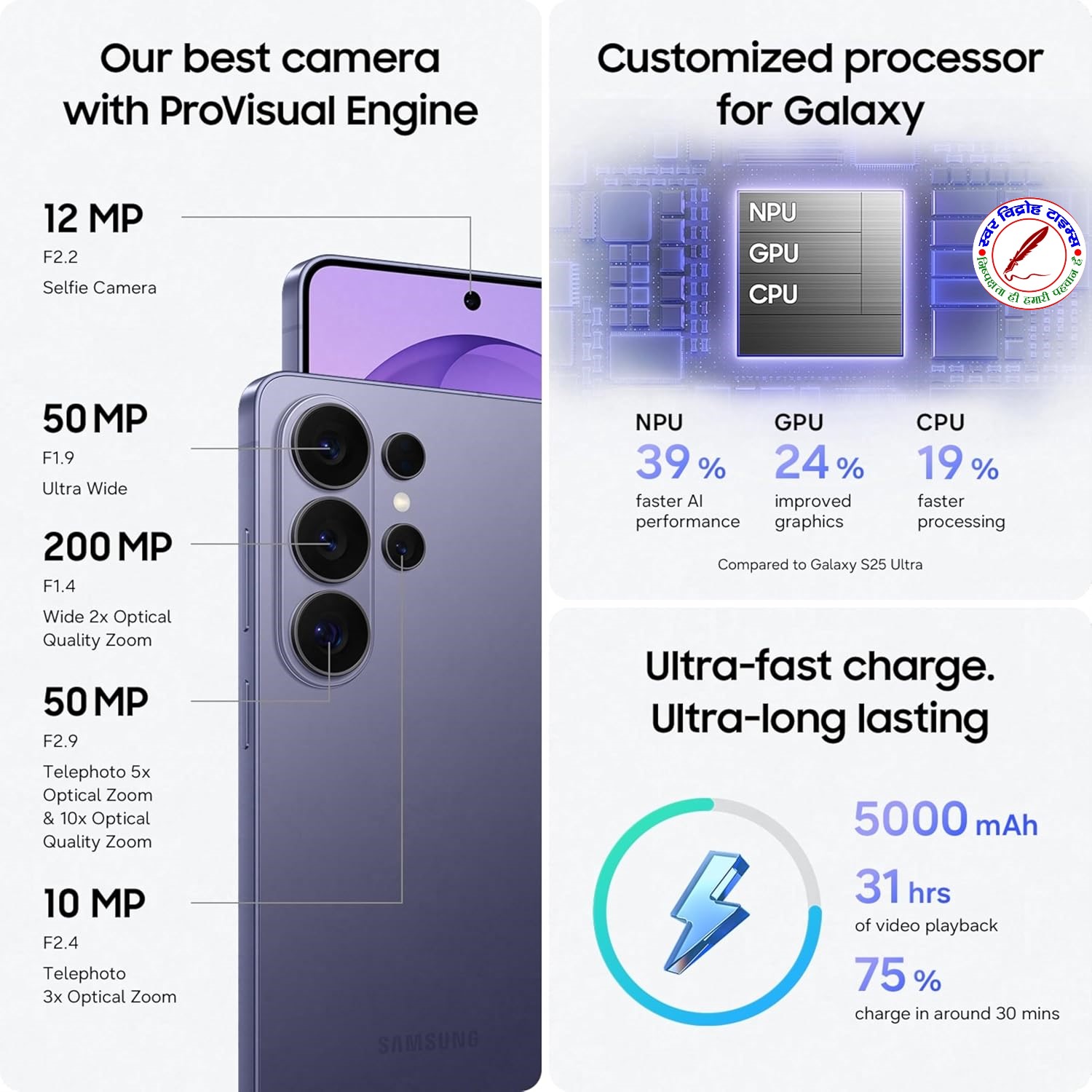 Galaxy S26 Ultra की सबसे खास खूबियों में से एक इसका कैमरा सिस्टम होने की संभावना है। चर्चा है कि Samsung एक क्रांतिकारी 200MP का प्राइमरी सेंसर पेश करेगा, जिसमें कम रोशनी में भी बेहतर तस्वीरें लेने की क्षमता और AI-की मदद से इमेज प्रोसेसिंग की सुविधा होगी। इसके साथ ही, फोन में कई टेलीफोटो लेंस हो सकते हैं जो 10x तक का ऑप्टिकल ज़ूम और काफी बेहतर डिजिटल ज़ूम देंगे, जिससे स्मार्टफोन फोटोग्राफी के क्षेत्र में Samsung का दबदबा कायम रहेगा।