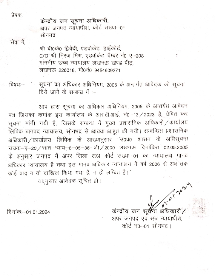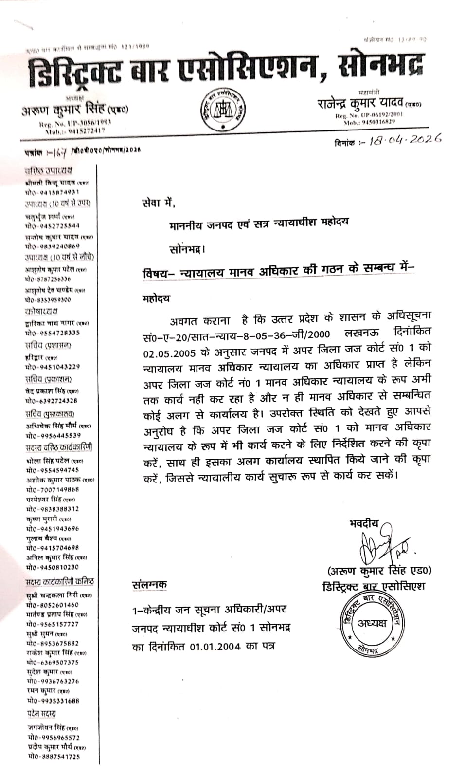 18 अप्रैल 2026 : डिस्ट्रिक्ट बार एसोसिएशन सोनभद्र के अध्यक्ष अरुण कुमार सिंह ने माननीय जनपद एवं सत्र न्यायाधीश महोदय जनपद सोनभद्र को एक पत्र देकर मांग किया कि उत्तर प्रदेश के शासन की अधिसूचना संख्या -ए -20/सात -न्याय -8-05-36-जी /2000 लखनऊ दिनांकित 25 मई 2005 के अनुसार जनपद में अपर जिला जज कोर्ट संख्या- एक को न्यायालय मानवाधिकार न्यायालय का अधिकार प्राप्त है, लेकिन अपर जिला जज कोर्ट नंबर 1 मानवाधिकार न्यायालय के रूप में अभी तक कार्य नहीं कर रहा है और ना ही मानवाधिकार से संबंधित कोई अलग से कार्यालय है उपरोक्त स्थिति को देखते हुए आपसे अनुरोध है कि अपर जिला जज कोर्ट संख्या एक को मानव अधिकार न्यायालय के रूप में कार्य करने के लिए निर्देशित करने की कृपा करें साथ ही इसका अलग कार्यालय स्थापित किए जाने की मांग की जिसे न्यायालय कार्य सुचारू रूप से कार्य कर सके! जिससे यहां पर मानवाधिकार से संबंधित केस न्यायालय में दाखिल कर अपने मानवाधिकार हनन रुक सके| इस अवसर पर पूर्व अध्यक्ष जगजीवन सिंह एडवोकेट पूर्व वरिष्ठ उपाध्यक्ष पवन कुमार सिंह एडवोकेट वरिष्ठ अधिवक्ता राजेश कुमार यादव, अमित वर्मा, टीटू प्रसाद गुप्ता, अरुण कुमार गुप्ताएड, आदर्श पाण्डेय आदि लोग उपस्थित रहे|