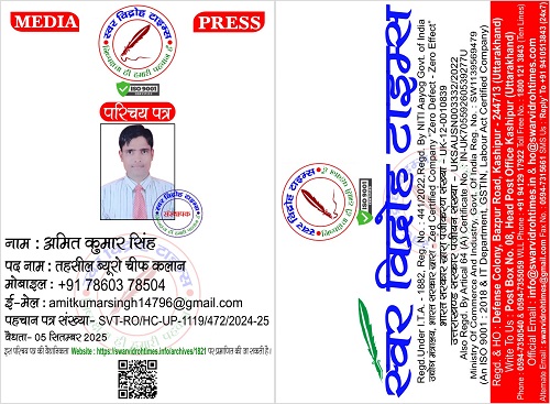 तहसील ब्यूरो चीफ कलान   मोबाइल : +91 78603 78504   ई – मेल : amitkumarsingh14796@gmail.com