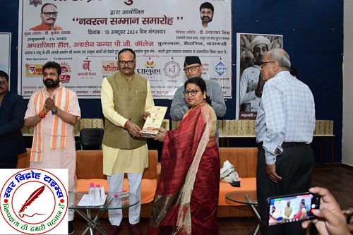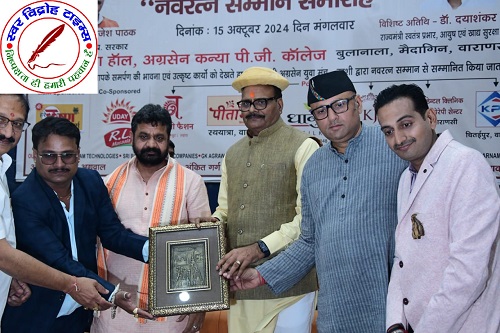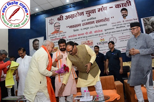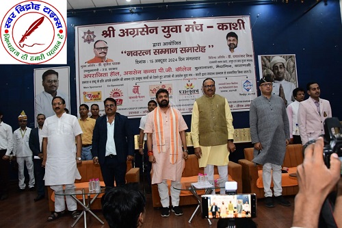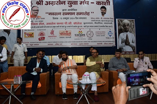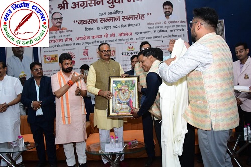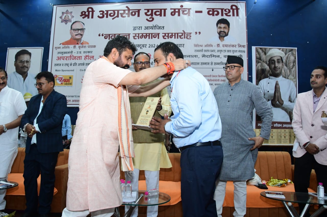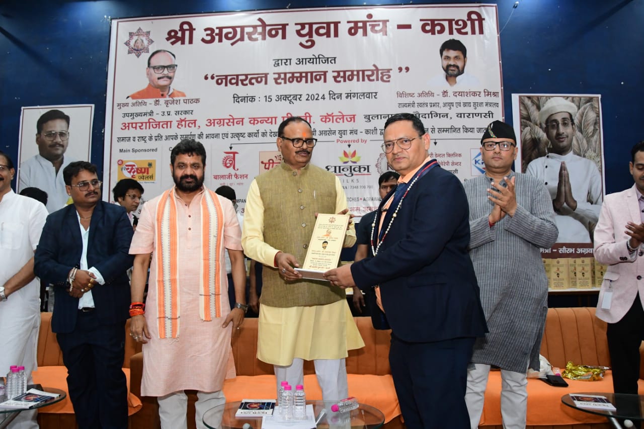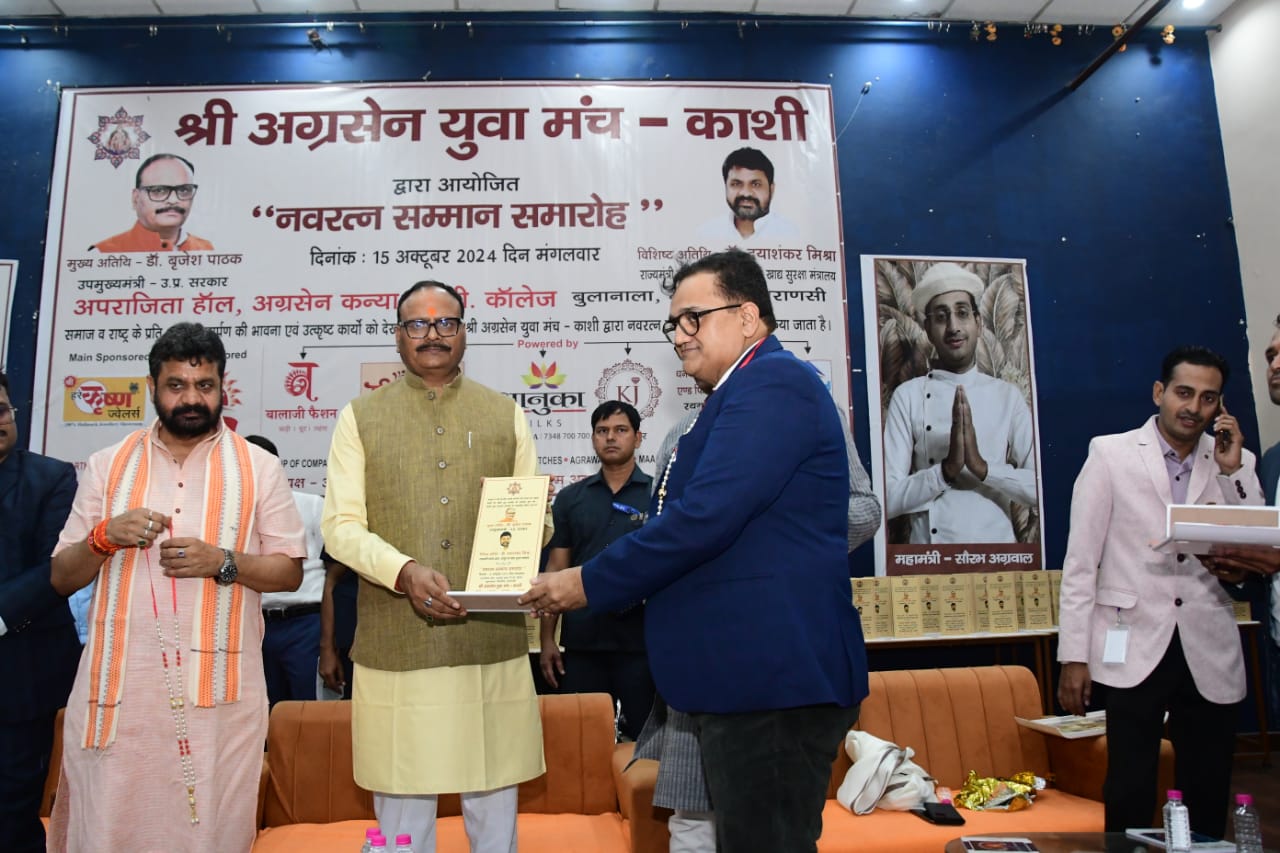 16 अक्टूबर 2024 : श्री अग्रसेन युवा मंच द्वारा हुआ “नवरत्न सम्मान समारोह” का आयोजन । सम्मान समारोह श्री काशी अग्रवाल समाज के अग्रसेन कन्या पीजी कॉलेज, बुलानाला के अपराजिता हॉल में आयोजित हुआ । “नवरत्न सम्मान समारोह” में काशी के प्रतिष्ठित 9 वर्गों काशी के नौ वर्ग जैसे (सर्वश्री अग्रवाल समाज, शिक्षक, सेवा संस्थान, चार्टर्ड एकाउंटेंट, वकील, चिकित्सक, न्यूज मिडिया एजेंसी, सोशल मिडिया इन्फ़्लुएन्सर, व्यापारी अथवा उद्योगपति) का चयन कर हुआ सम्मान । मंच होस्ट सुश्री स्वाति अग्रवाल ने सभी अतिथियों का श्री अग्रसेन युवा मंच-काशी द्वारा आयोजित यह नवरत्न सम्मान समारोह में स्वागत किया । मंच परिवार द्वारा आयोजित नवरत्न सम्मान समारोह में बतौर मुख्य अतिथि उत्तर प्रदेश के माननीय उपमुख्यमंत्री डॉक्टर ब्रजेश जी पाठक की गरिमामयी उपस्थिति हुई । विशिष्ट अतिथि के रूप में उत्तर प्रदेश के माननीय राज्यमंत्री स्वतंत्र प्रभार-उत्तर प्रदेश, आयुष एवं खाद्य सुरक्षा मंत्रालय के मंत्री डॉक्टर दयाशंकर जी मिश्रा जी की गरिमामयी उपस्थिति हुई साथ ही कैंट विधायक श्री सौरभ जी श्रीवास्तव की भी उपस्थिति हुई । मंच के अध्यक्ष श्री अतुल जी अग्रवाल ने मुख्य अतिथि डॉक्टर ब्रजेश जी पाठक का अंगवस्त्रम से सम्मान किया । मंच के संरक्षक एवं समाज सभापति संतोष जी अग्रवाल ने मुख्य अतिथि को पगड़ी पहनाकर सम्मान किया । मंच के अध्यक्ष श्री अतुल जी अग्रवाल ने विशिष्ट अतिथि का अंगवस्त्रम से सम्मान किया । मंच महामंत्री श्री सौरभ जी अग्रवाल ने विशिष्ट अतिथि को माला पहनाकर सम्मान किया । तत्पश्चात इसी क्रम में मंच अध्यक्ष श्री अतुल जी अग्रवाल ने स्वागत भाषण के साथ कार्यक्र को आगे बढाया ।