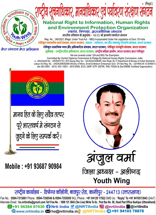 29 जनवरी 2025 : “राष्ट्रीय सूचनाधिकार, मानवाधिकार एवं पर्यावरण संरक्षण संगठन” की राष्ट्रीय अध्यक्षा / संस्थापक सुश्री आस्था माथुर जी ने संगठन संस्थापक सदस्य श्री अमन माथुर जी की संस्तुति पर संगठन की विस्तारवादी नीति तथा संगठन में युवाजन को भागीदारी देने के उद्देश्य से, संगठन की यूथ विंग इकाई में श्री अंजुल वर्मा को अवैतनिक रूप से जिलाध्यक्ष यूथ विंग अलीगढ़ के पद पर मनोनीत किया । संगठन यूथ विंग के सदस्यों एवं पदाधिकारियों ने नव मनोनीत जिलाध्यक्ष श्री अंजुल वर्मा को शुभकामनाएं एवं बधाई प्रेषित कर आशा व्यक्त की, कि वह संगठन की नीतियों को जन – जन तक पहुंचाएंगे एवं संगठन का विस्तार अपने जिले में करेंगे । संगठन के सदस्यों एवं पदाधिकारियों ने नव मनोनीत जिलाध्यक्ष यूथ विंग अलीगढ़ श्री अंजुल वर्मा आशा व्यक्त की, कि वह संगठन के माध्यम से अपने जिले की आवाज बन कर उभरेंगे और सदैव पीड़ित व्यक्ति को न्याय दिलाने को तत्पर रहते हुए संगठन हित में कार्य करेंगे ।*”राष्ट्रीय सूचनाधिकार, मानवाधिकार एवं पर्यावरण संरक्षण संगठन”* से जुड़े रहने के लिए आप संगठन के सोशल मीडिया साइटो पर भी जा सकते है –