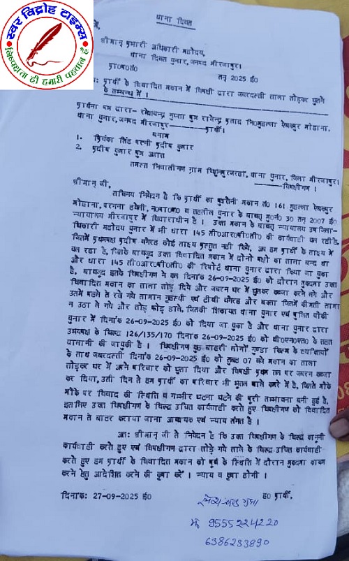 27 सितम्बर 2025 : कोतवाली में शनिवार को आयोजित थाना दिवस में एसडीएम राजेश कुमार वर्मा ने फरियादियों की समस्याओं को सुना । कोतवाली में पहुंचे फरियादियों ने अपनी समस्या और पीड़ा को सुनाया । जिसमें नगर कस्बा क्षेत्र के ऐबकपुर निवासी रमेश गुप्ता ने दिवस में प्रार्थना पत्र देकर कहा कि मेरा पुस्तैनी मकान का विवाद सिविल कोर्ट में चल रहा है । विवाद के चलते 145 कि कार्यवाही चल रहा है । मकान में तीन वर्ष से ताला बंद था । दूसरे गांव के लोग विपक्षी एक राय होकर मकान का ताला तोड़कर जबरिया घर में घुस कर कब्जा कर लिया और उसमें रखा मेरा सामान तोड़ फोड़ कर फेक दिया । प्रार्थना पत्र देकर मदद की गुहार लगाया । कुल 11 प्रार्थना पत्र आया जिसमें एक भी प्रार्थना पत्र का निस्तारण नहीं हुआ ।