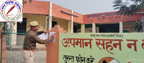 25 दिसम्बर 2025 : पुलिस ने नव विवाहिता की मौत के मामले में कोर्ट के आदेश पर आरोपी के गांव पचेवरा स्थित घर पर, पंचायत भवन व प्राथमिक स्कूल पर नोटिस चस्पा करते धारा 82 की कार्यवाही पूरी किया । नव विवाहिता आंशी सिंह पुत्री शिवेंद्र सिंह काबुल का विगत माह 31 अक्तूबर को रात्रि में संदिग्ध परिस्थित में मौत हुई थी । जिसमें मृतिका के पिता मगरहा गांव निवासी शिवेंद्र सिंह काबुल ने पति अजीत सिंह, ससुर पारस नाथ सिंह, सास आशा व ननद सान्या उर्फ रेनू के विरुद्ध दहेज हत्या का मुकदमा दर्ज कराया था । जिसमें ससुर पारस नाथ सिंह, सास आशा और ननद सान्या उर्फ रेनू फरार चल रही हैं । जिसमें कोर्ट के आदेश पर गुरुवार को उप निरीक्षक दिलीप सिंह, सुरेन्द्र कुमार ने अभियुक्त पारस नाथ सिंह के पचेवरा गांव स्थित आवास पर धारा 82 का नोटिस चस्पा कर गांव में डुगडुगी पिटवा कर कार्यवाही पूरी किया ।